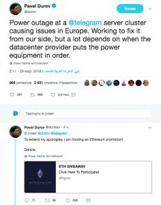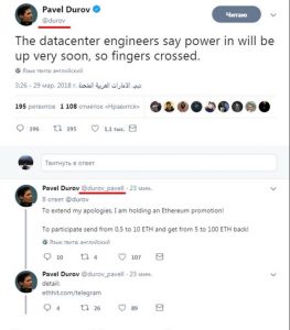 Мошенники воспользовались техническими неполадками в работе мессенджера Telegram и опубликовали в Twitter призывы отправить по 0,5 ETH и 0,5 BTC на криптокошельки, якобы принадлежащие Дурову, «в рамках лотереи», организованной  в качестве «извинения за предоставленные неудобства».