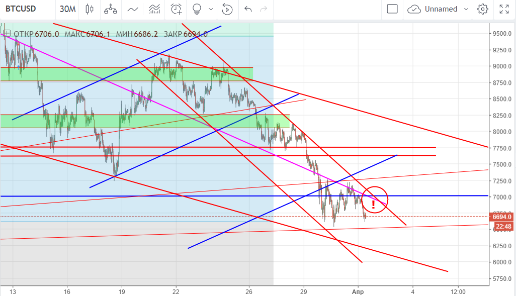 Чтобы расти, биткойну надо выйти вверх из нисходящего канала, выше $7 000.