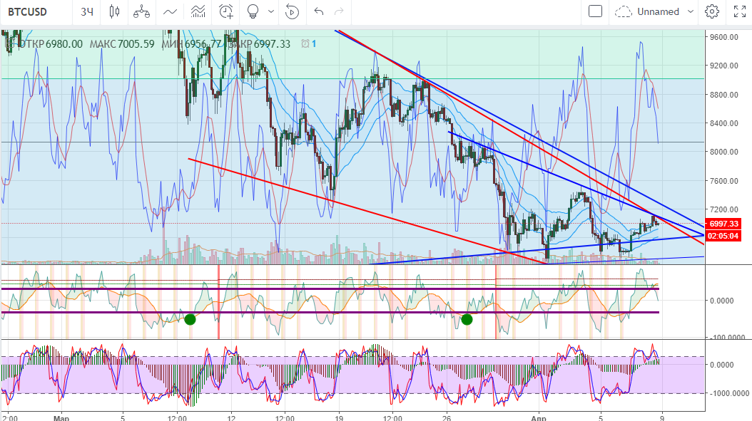 На часовом графике имеем четко сформированный медвежий клин, чтобы уверенно падать дальше, желательно уйти ниже $6 900. Если не случится чуда, то, скорее всего, так и будет. Как и в прошлые дни, это может занят некоторое время.