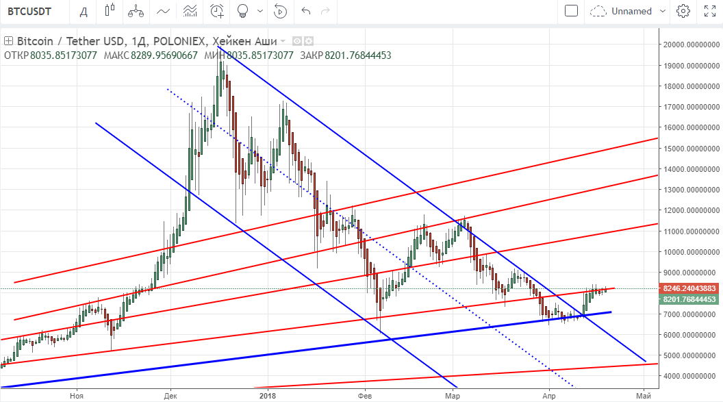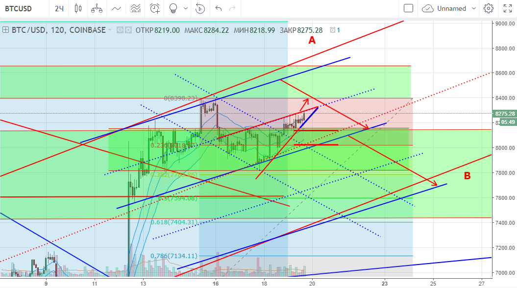 Сегодня день для биткойна и для рынка в целом складывается довольно удачно: практически все монеты показывают хороший рост. В течение дня биткойн тестирует линию сопротивления треугольника, которая открывает выход к заветным $8 400 — $8 650. Фаза роста продолжается, и даже если цена не сможет сегодня закрепиться выше $8 400 и спустится обратно к середине канала А-В — к $8 000 (или даже к нижней его границе – к $7 700 -$7 600), это можно рассматривать как коррекцию роста. Биткойн пока в боковике, но это дает возможность накопить силы для следующего рывка.