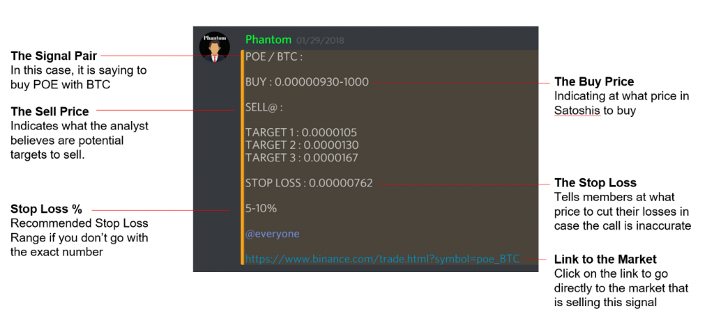 Когда аналитик достаточно уверен в своём предсказании будущего тренда (обычно о возможности купить токены), он публикует её на своём канале. Существуют целые сообщества (к примеру, Cosmic Trading Group), члены которых могут изучать различные сигналы и принимать решения, какой из них использовать. Обычно такие предсказания включают в себя несколько видов информации: