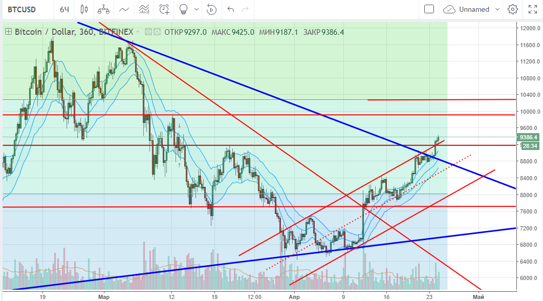 Тренд по-прежнему растущий, поддержка теперь на $9 200 — $9 000. Следующая цель $9 900 — $10 000. Правда есть один момент – рост количества контрактов на фьючерсы. Опять будут попытки уронить рынок?