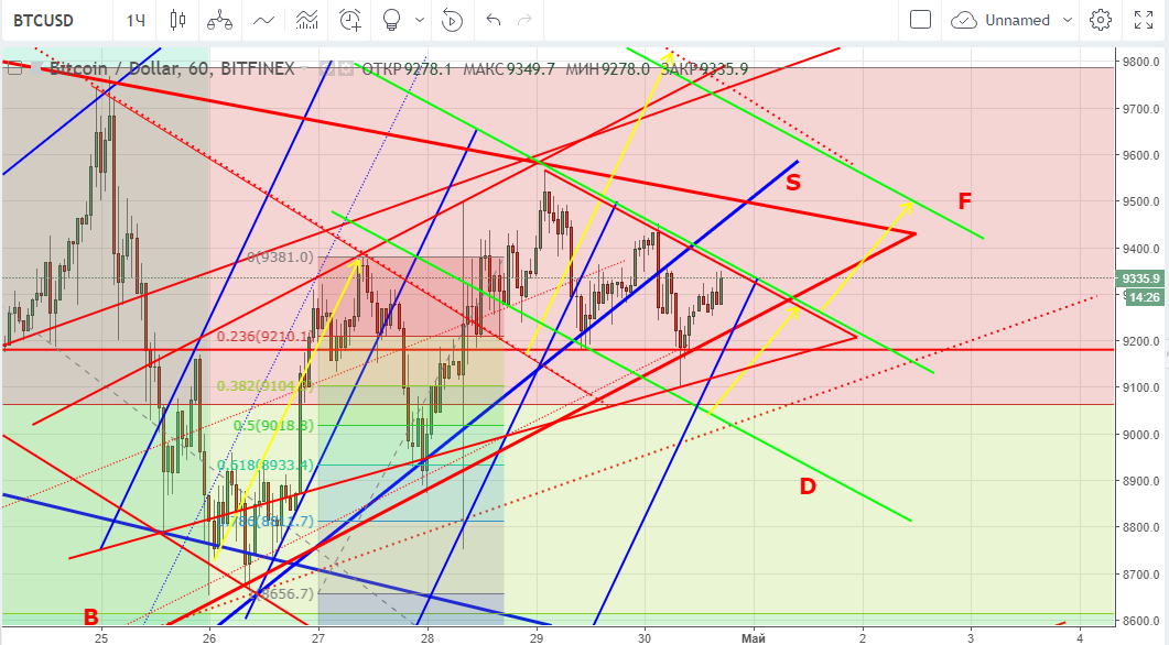 На данный момент ожидаю тест середины границы канала D-F (зеленый на графике) с целью выхода к линии сопротивления А (примерно $9 500). Боковик никуда не делся, и может еще некоторое время вносить свои коррективы в дальнейшее движение рынка. В целом вероятность продолжения роста выше.