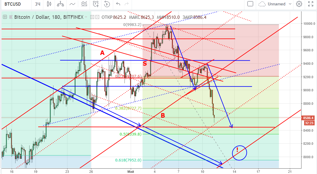Вчерашний прогноз отработал довольно точно, минимум за сегодня $8 510 (Bitfinex), но, как говорится, еще не вечер. Такими темпами могут попытаться и к $8 000 утянуть цену. Хотя, сейчас небольшая коррекция все же напрашивается.