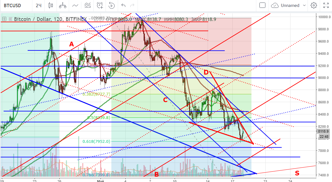 Собственно, пока придерживаюсь предыдущего прогноза. Должен быть тест линии тренда в диапазоне $7 650 — $7 400 (78.6% фибо коррекции роста). Но, есть еще вариант, что ниже $7 700 уйти не дадут и все откупят, так что ордера на покупку лучше распределить.