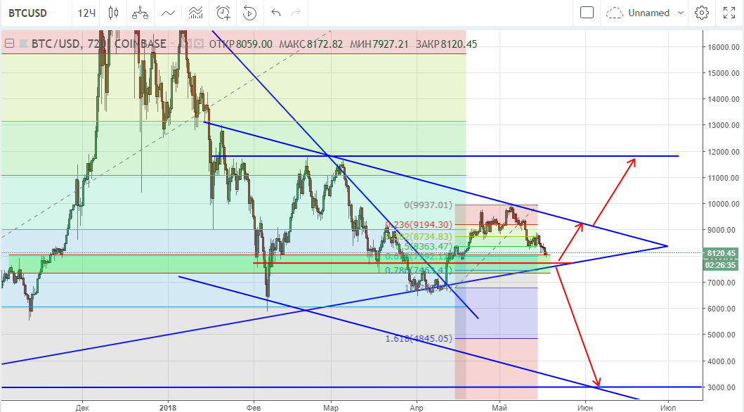 Более реальный сценарий – рост до $9 170, тест на прочность верхней границы треугольника с целью выхода к прошлому максимуму $11 700.