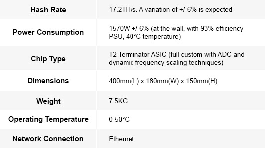 Innosilicon Terminator 2 (T2) Miner — это новый майнер SHA256 ASIC для майнинга биткойнов (BTC) и других криптовалют с использованием того же алгоритма, который использует технологический процесс 10nm при производстве чипов.. Это не первый асик, использующий этот процесс, но, без сомнения, это следующий шаг для достижения более высокой производительности и снижения энергопотребления. Согласно официальным характеристикам устройства, Innosilicon Терминатор 2 ASIC Miner способен выдавать 17.2 TH/s при энергопотреблении примерно 1570W. Характеристики: