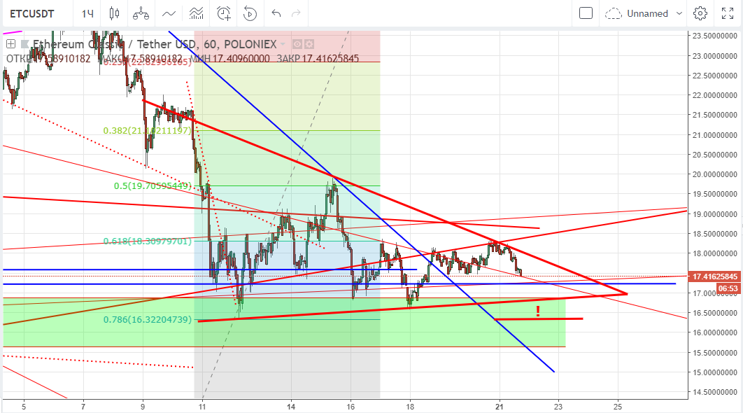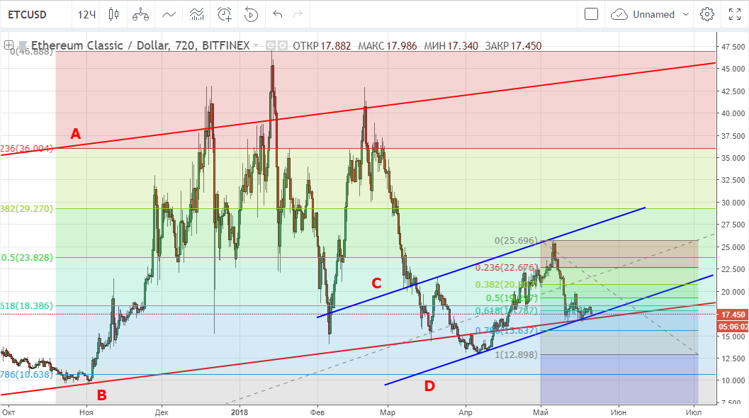 Классик опять вплотную подошел к нижней границе канала АВ и подканала CD, поэтому есть смысл сделать покупку, не на все котлету, разумеется. Если биткойн не прольют ниже ближайшее время, то стоит ожидать роста классика.
