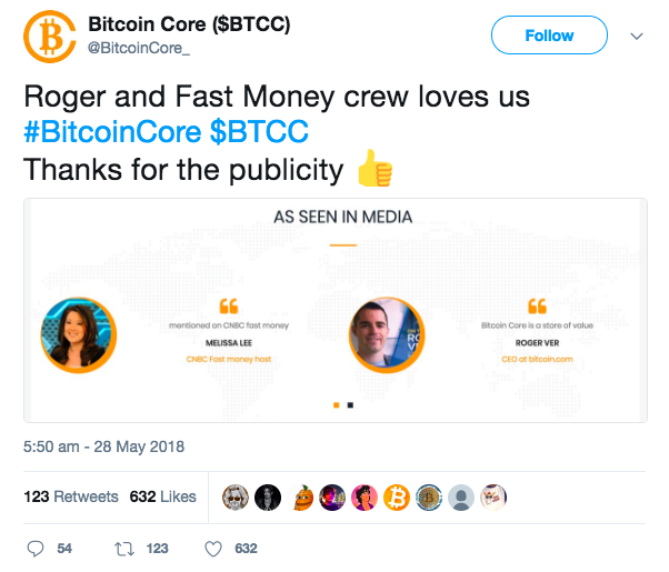 Команда шутит, что им не нужна была широкая маркетинговая кампания благодаря тому, что CEO Bitcoin.com Роджер Вер устроил им ее самостоятельно, непрерывно упоминая Bitcoin Core. Команда «Bitcoin Core» отдельно поблагодарила Роджера Вера за бесплатный PR в Twitter: