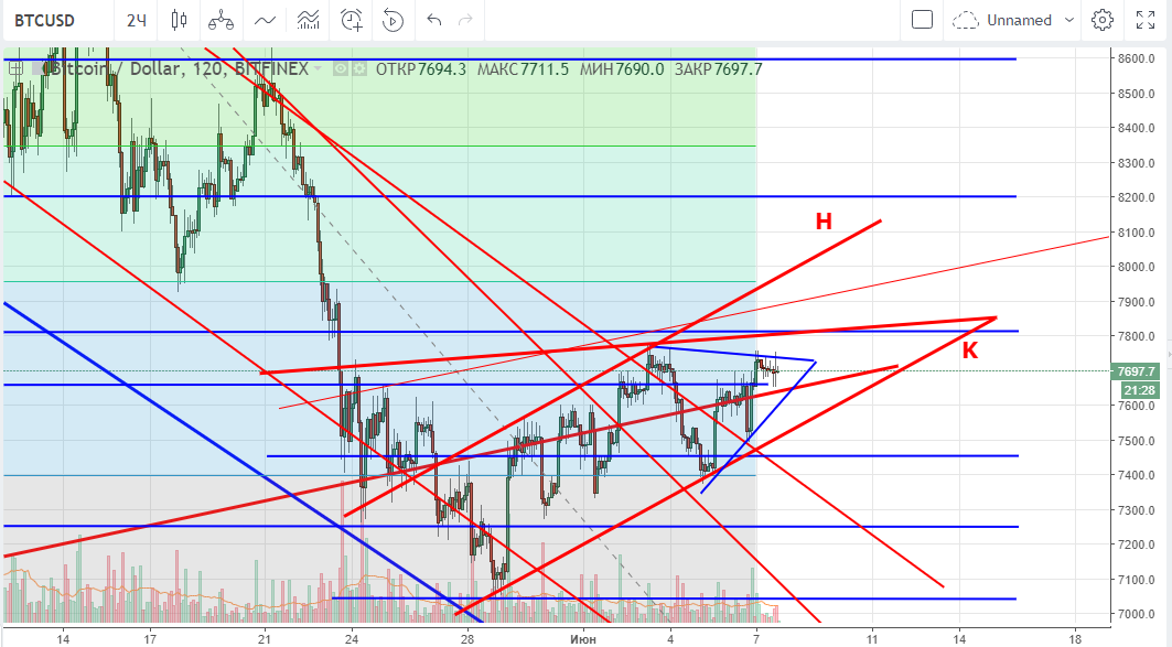 На данный момент главная задача биткойна – не уйти ниже границы подканала H-K ($7 550), это может спровоцировать падение к $7 250 — $ 7 050.