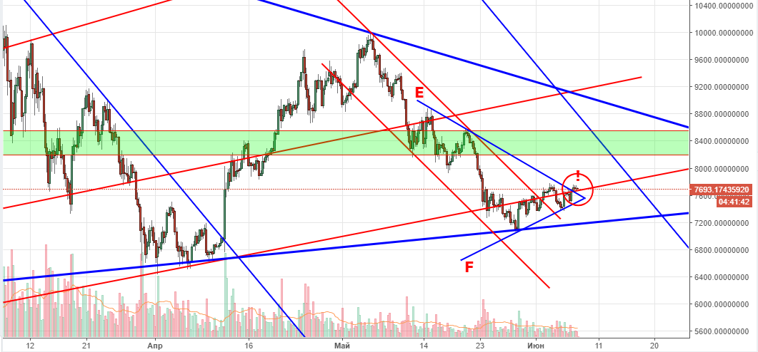 Даже тот момент, что биткойн преодолел сопротивление в треугольнике E-F и оказался выше линии поддержки тренда, пока не оказывает положительного влияния на ситуацию.
