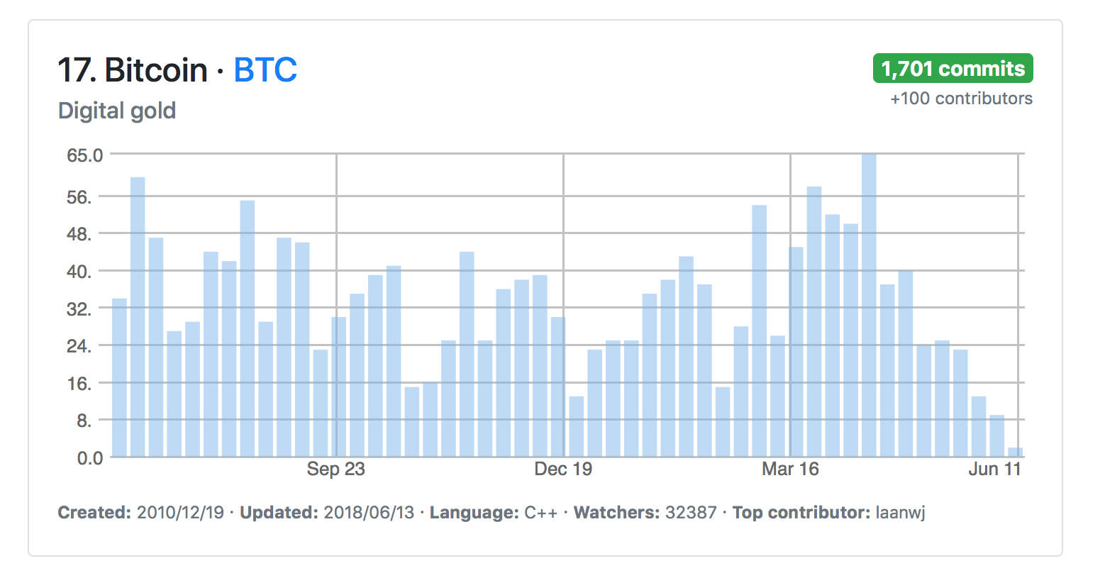 Само собой, блокчейн разработчики не обошли стороной Github — рост числа пользователей и репозиториев пришелся на годы становления блокчейн-технологии с последующим ростом её популярности. Количество правок в коде на Github, как показатель регулярной работы, стало критерием качества для множества проектов, за которыми наблюдает мировое блокчейн-сообщество. К слову, по данным сервиса Cryptomiso.com, биткойн находится на 17 месте по количеству коммитов среди всех криптовалют за последние 12 месяцев.
