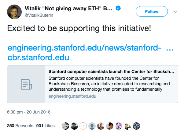 Сооснователь Эфириума Виталик Бутерин 20-го июня опубликовал в Twitter пост, подтверждающий участие Ethereum Foundation в запуске блокчейн-инициативы: