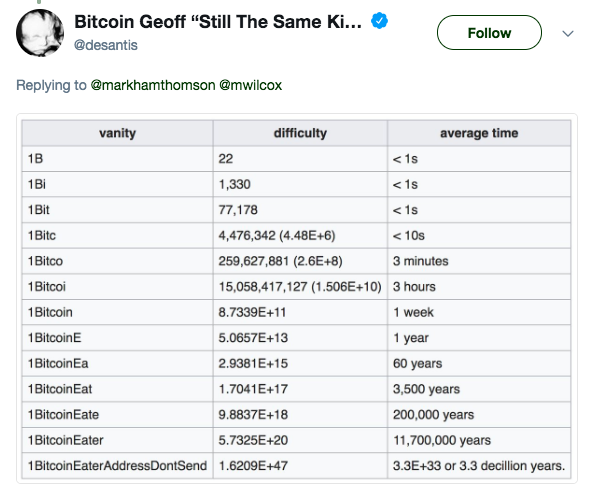 Если код действительно является «хэшом тщеславия», и кто-то намеренно создал его, а для этого требуется вычислительная мощность, превышающая возможности любого современного компьютера, то на его создание потребовалось бы колоссальное время, как продемонстрировал в публикации в Twitter разработчик Эндрю Десантис, @desantis: