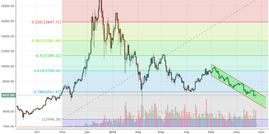 Движение вверх «забуксовало», со вчера биткойн стоит на месте, а объемы на покупку снова упали. С такими объемами проще двигаться вниз, чем вверх. На дневном графике видно, что цена все еще находится в нисходящем канале, и для его прорыва покупателям необходим прорыв сопротивления на $6 850.