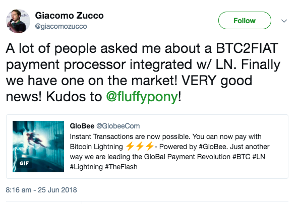 «Многие интересовались интеграцией BTC-фиат платежей с сетью Lightning. На рынке уже есть такое решение Отличные новости! Респект @fluffypony!»