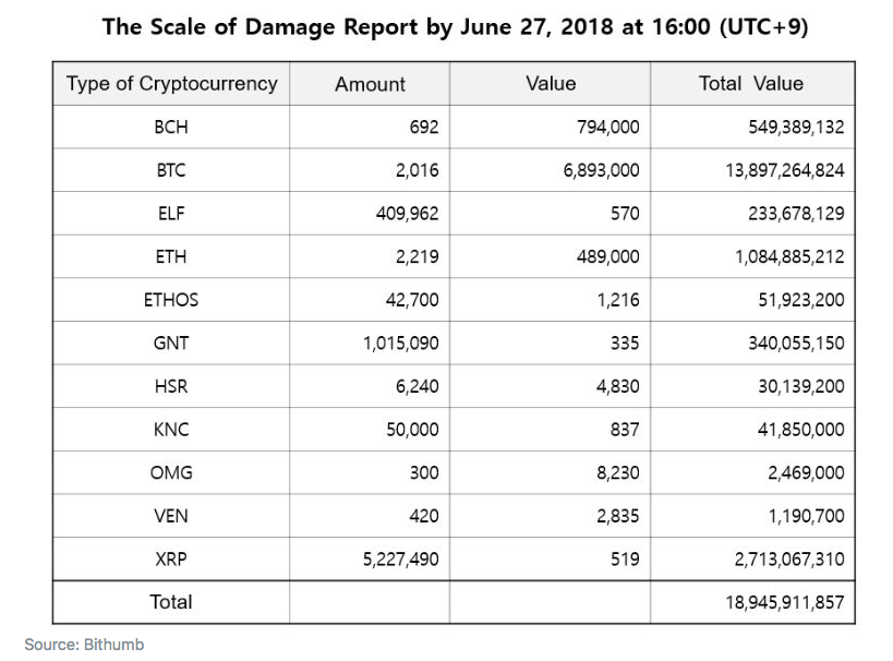 В четверг криптобиржа Bithumb объявила, что ей удалось восстановить более 45% украденных средств, снизив ущерб от совершенной 20-го июня хакерской атаки до 19 млрд корейских вон (около 17 млн долларов). Издание CCN опубликовало таблицу с объемами потерь криптобиржи, ссылаясь на сообщение Bithumb.