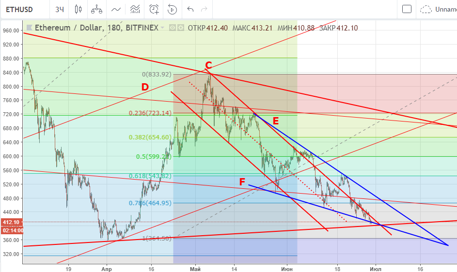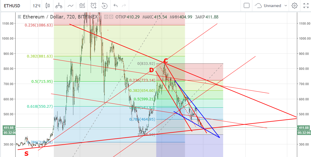 Так или иначе, но ближайшие дни вопрос вниз или вверх должен быть решен: сверху линия сопротивления падающего подканала C-D, снизу линия поддержки S, вдобавок эфир нарисовал бычий клин. Если биток ближайшие дни существенно не просядет, то можно считать текущий диапазон $411 — $400 неплохой точкой входа для коротких позиций со стопом 3% от цены закупки.