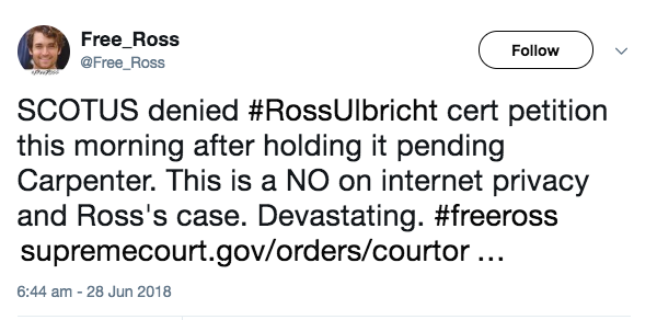 «Верховный суд отказал в пересмотре дела Росса Ульбрихта этим утром… Это значит «НЕТ» неприкосновенности личной информации в интернете. это сокрушительно «