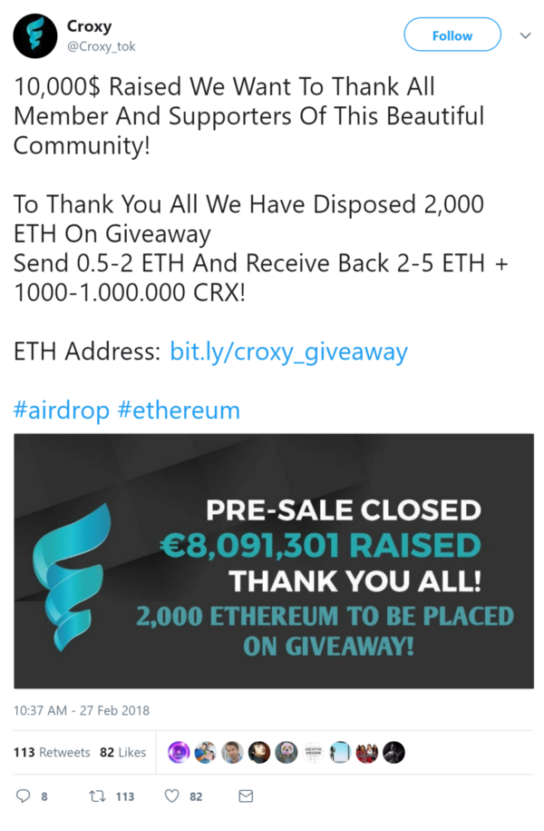 Если вы посмотрите на сам профиль, то увидите, что он имеет более 3000 подписчиков, но первый твит был отправлен менее 24 часов назад (по отношению к времени публикации фейкового эйрдропа). Понимаете, о чём я? Разработчики токена, который, как утверждается, смог привлечь 8 миллионов евро, начали вести твиттер менее суток назад ? Если история кажется вам подозрительной, значит, где-то неподалёку действительно лежит разлагающийся труп. Не верьте в эту сказку.