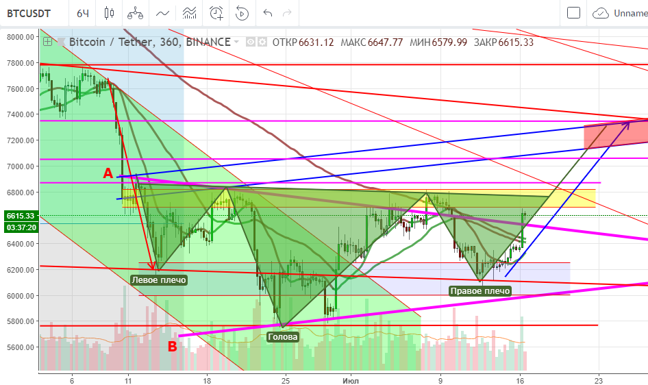 На текущий момент появились объемы на покупку + было пробито сопротивление треугольника A-B. Биткойну для продолжения импульса желательно закрыть текущий день выше отметки $6 500.