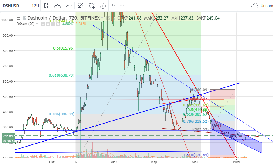 Dash (DSH/USD). Курс Дэш на сейчас составляет $244.5, по этой же цене монета торговалась аж в Сентябре 2017, а недавний минимум 10 Июля 2018 составил $207. Если вспомнить, что в Декабре 2017 цена Дэш почти доходила до отметки $1600, то даже текущие $244 выглядят довольно неплохой ценой для покупки монетки. Если вы ожидаете разворота, конечно.