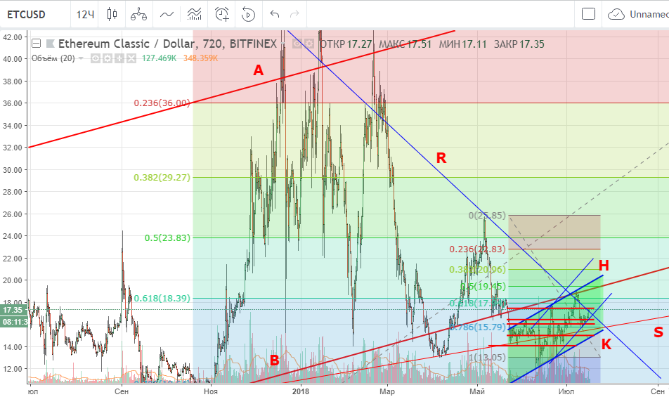 Ethereum Classic (ETC/USD). Классик, как и весь топ, восстанавливает свои позиции вслед за биткойном. На данный момент монета торгуется на отметке $17.3, но дальнейшему росту мешает сильное сопротивление на $17.5 (линия сопротивления R), для продолжения нужен еще один импульс, либо цена классика снова может вернуться в коридор $16.5 — $16 на некоторое время.