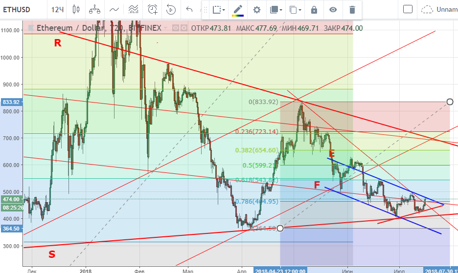 Ethereum (ETH/USD). Эфир за последние дни вырос более, чем на $45 и на текущий момент торгуется на отметке $474 (Bitfinex). Даже на этом уровне монета интересна для покупки на перспективу: цена находится чуть выше нижней границы треугольника RS в подканале EF, где уровень $480 пока выступает сильным сопротивлением.