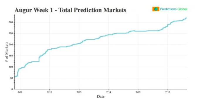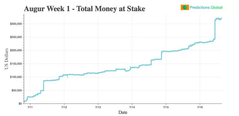 Платформа для ставок и предсказаний Augur, по данным Predictions.Global, быстро набирает аудиторию, а объем транзакций уже превысил 1 млн $.