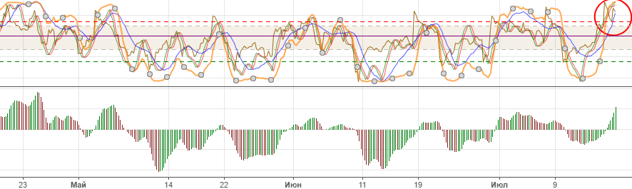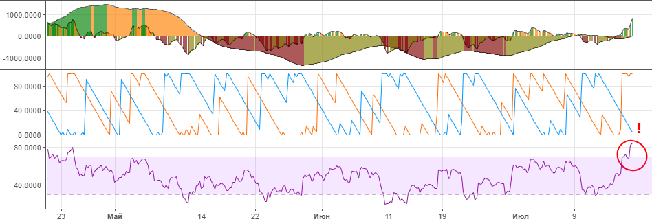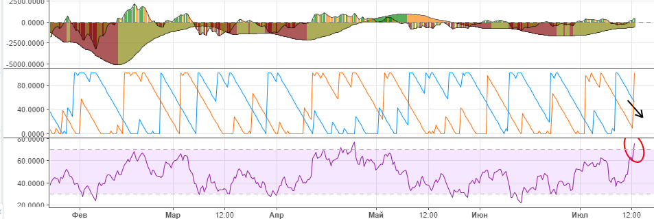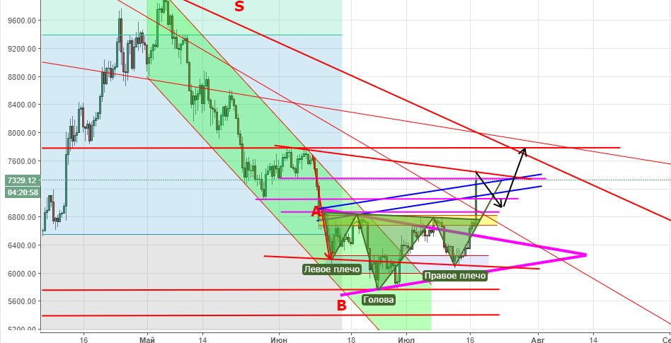 Ближайшее время предполагаю коррекцию к $7 050 — $6 850 с последующей целью теста $7 780 (там проходит сильное сопротивление – линия S, и пока рассматриваю это движение только в качестве коррекции падения, без эйфории). В целом позитив, но, глядя на 6-12 индикаторы (обратите внимание на RSI по 6 часам — фиолетовый) большую часть позиций сократил у $7 400.