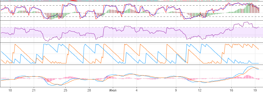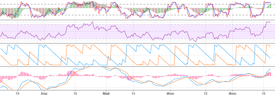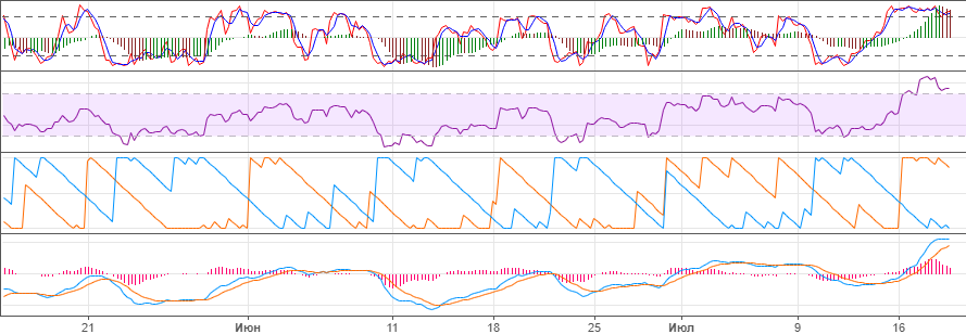 По 3-6-12 часам индикаторы указывают на имеющуюся перегретость рынка. Чтобы их разгрузить нужна либо коррекция, либо флэт. Поскольку падать не дают, то более реальным на сейчас видится боковик.
