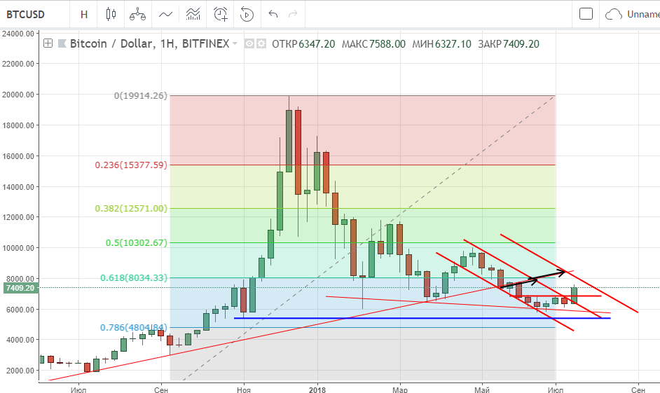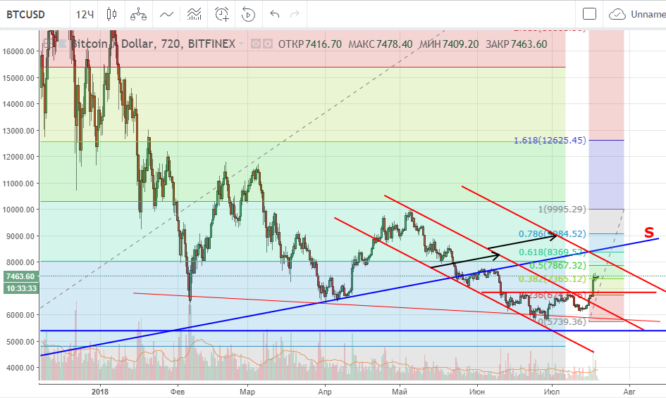 Итак, что мы имеем на сегодня. Формально падение биткойна продолжается: цена движется вниз в нисходящем канале A-B, как я упоминал до этого, текущее движение пока рассматриваю в рамках коррекции с $10 000. Цель ближайшего времени – проверить на прочность полку на $7 780 — $7 880 (последний совпадает с 50% фибо коррекции падения от 10К), возможно даже коснемся круглых $8 000. Понятно, что выше находятся $9 000 и $10 000, но пока цена битка не зафиксируется выше границы канала и линии сопротивления S (то есть выше $8 500), говорить о росте довольно преждевременно, тем более, что подобную ситуацию мы в этом году видели не раз.