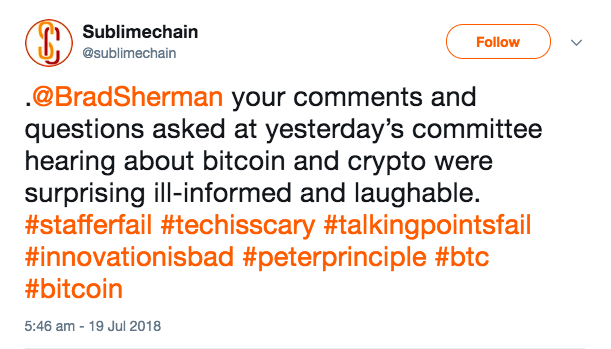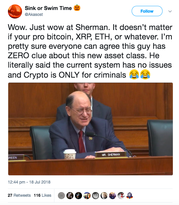 @BradSherman ваши комментарии и вопросы на вчерашнем слушании комитета о биткойне и криптовалютах неожиданным образом продемонстрировали вашу неосведомленность и могут вызвать только насмешки.
