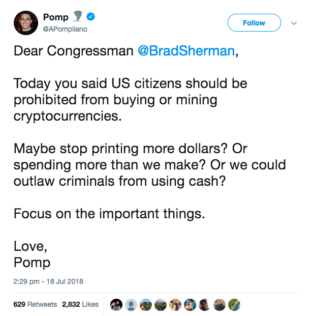 «Дорогой конгрессмен @BradSherman, сегодня вы заявили, что гражданам США надо запретить продавать и майнить криптовалюты. Может, вы прекратите печатать доллары по собственному усмотрению? Или тратить больше, чем мы зарабатываем? Или мы можем полностью запретить преступникам использовать наличные? Сфокусируйтесь, пожалуйста, на важных вещах. С любовью, Pomp»