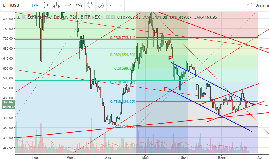 Эфир на текущий момент выглядит довольно привлекательно для покупки. Цена сейчас находится у фибо 78,6% (коррекция падения с $830). Ближайшая цель движения вверх находится на $500, $525, $544 (фибо 61,8%).
