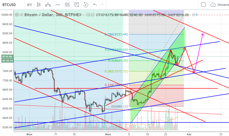 Второй вариант – проходим $8 600, и, тогда уже открывается дорога к майскому максимуму $9 990 с остановкой на $9 155 (фибо 78,6%). Пойдем выше или нет, уже другой вопрос – там будет видно. Пока же на рынке произошел перелив из альты в биток (альта за редкими исключениями эти дни топчется на месте). Значит при условии реализации этого сценария, сейчас довольно интересная точка входа по многим топовым альткойнам (например: ETC, ETH, LTC, ZEC, SAN, EOS, OMG, и т.д. Все монеты не смотрел пока, но по топу альты завтра сделаю обзор).