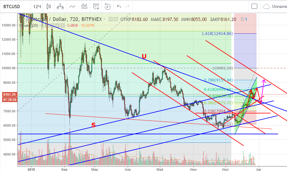 Bitcoin BTC/USD. Выходные и вялые движения на рынке. Думаю, к понедельнику ситуация начнет разрешаться. Перекупленность на индикаторах пока не в пользу быков, но, даже ситуация с переносов сроков рассмотрения ETF смогла лишь немного снизить цену к $7 800, после чего все откупили, и биток снова ушел выше отметки $8 000. Сейчас многие ждут коррекции, но, не стоит забывать, что маркетмейкеры играют против толпы. А, значит, коррекции сейчас может и не быть – затащат выше $8 600 на объемах, а там уже круглые 9К. Просто держите такой сценарий в голове. Причин для разворота цены вниз пока не вижу, поэтому придерживаюсь оптимистичного сценария увидеть в августе $10 000.