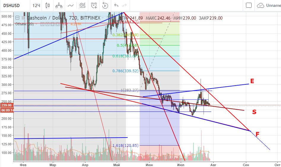 Дэш может ближайшее время «повыносить» трейдерам мозг — на графике сформировался локальный расширяющийся клин. С другой стороны, на старших таймферймах мы видим бычий клин, и с 20-го Июля было несколько попыток прорыва сопротивления, но цена снова возвращалась обратно. Итонго, текущий уровень на $240 можно рассматривать как перспективную покупку для долгосрока.