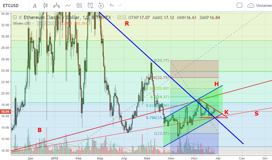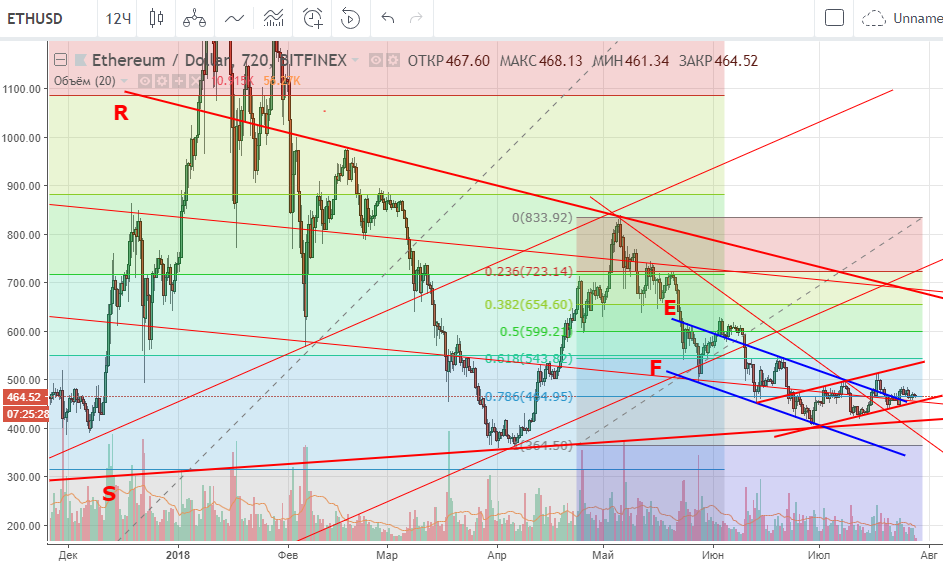 На текущий момент цена монеты прилипла к фибо 78,6% коррекции с $838 и составляет $464.