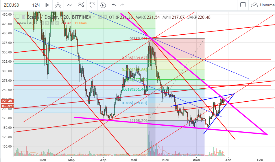 Зикэш выглядит несколько менее привлекательнее эфирок. На графике сформировался локальный медвежий клин, так что, возможно, будет некоторый откат. Опять же будет зависеть от ситуации на рынке. Если биток сейчас не пойдет вверх, то зикэш имеет право откатиться к $202. Ниже, конечно, есть еще полка на $180, но пока это выглядит маловероятно. Вслучае же роста биткойна, монета может и «наплевать» на эту формацию и пойти вверх. Альта она такая.