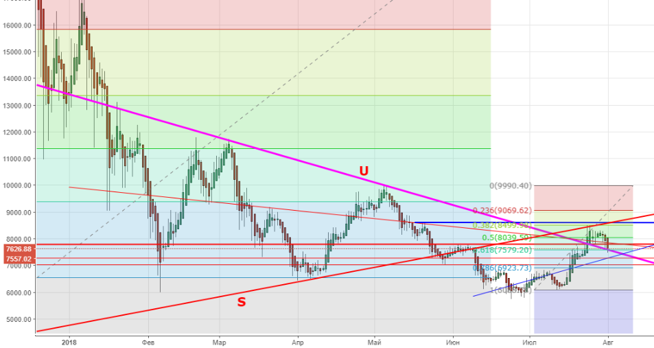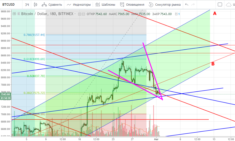 Все же биткойн пошел на коррекцию, был пролив до нижней границы подканала A-B и линии поддержки U. Эти факторы плюс фибо 38,2% затормозили падение. Сейчас объемы на покупку/продажу упали, по 3-6 часовым индикаторам ожидаю, что отсюда пойдет коррекция вверх к $7 930 (61,8% фибо).