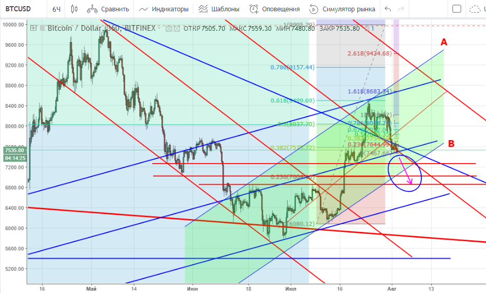 Пока ближайшее время возможно снижение в зону $7 260 — $7 040, может даже с проливом к $6 840. Там уже по ситуации, выдержит ли поддержка на этих уровнях. В таком случае цена остается в подканале AB и мы продолжаем движение вверх к $10К. При реализации медвежьего сценария и закрытии цены ниже $6 700 скорее всего идем обновлять низы.
