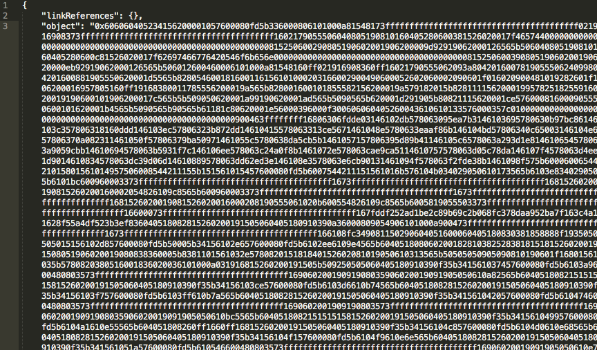 - Добавьте 0x в начало BYTECODE, например: “object”: “0xBYTECODE”,. После чего скопируйте получившееся в новый файл.
