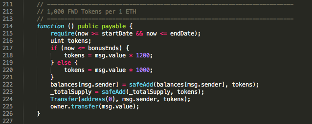 “msg.value” — это количество ETH, отправленных каким-либо участником краудсейла. Так, в нашем примере за каждый 1 ETH мы раздаём 1000 FWD.