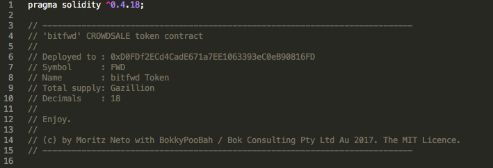 Перейдите к строкам 3-15 и обратите внимание на комментарии — они будут помогать вам в создании вашего токена. Шаблон ICO имеет название ‘bitfwd’ CROWDSALE token contract.