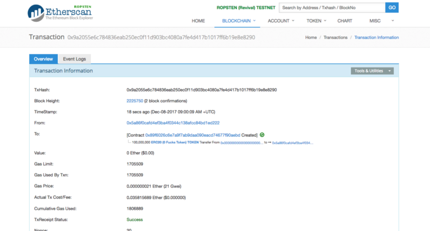 - Кликните на Transaction TX или перейдите на https://ropsten.etherscan.io, чтобы убедиться, что контракт ушёл в сеть. Если этого не произошло, попробуйте ещё раз и постарайтесь найти ошибку. Если же всё сработало — вас можно поздравить!