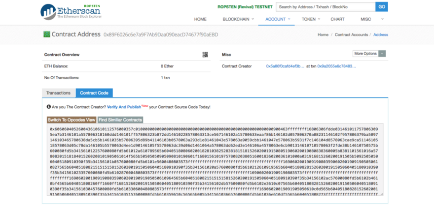 - Кликните на Transaction TX или перейдите на https://ropsten.etherscan.io, чтобы убедиться, что контракт ушёл в сеть. Если этого не произошло, попробуйте ещё раз и постарайтесь найти ошибку. Если же всё сработало — вас можно поздравить!