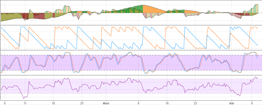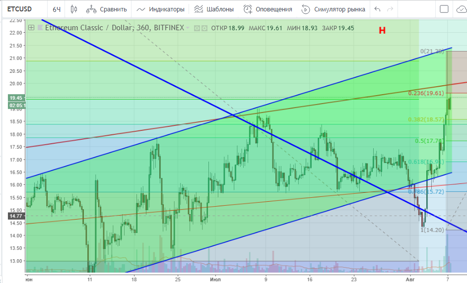 Классик очень неплохо подрос с $14,13 до $21,25 на новостях открытия торгов на Coinbase 8 августа. На данный момент цена опустилась к фибо 23,6%, а на 6-12 часовых индикаторах наблюдается перегретость (обратите внимание на RSI). Неплохо было бы на коррекцию, но завтрашний день покажет.