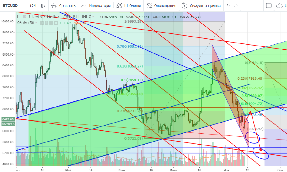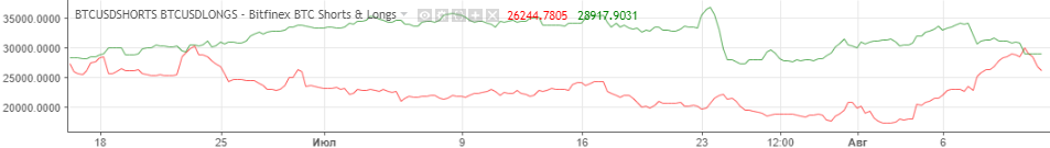Пока все согласно прошлой идеи: $6 600 — $6 700 пожалуй максимум, на что способны быки в данный момент. На графике показал соотношение лонгов с шортами: как видим, они пересеклись. А значит самое время вытряхнуть лишних пассажиров с поезда. Ближайшие важный уровень поддержки сейчас находится на $6 000 — $5 800, но, на негативных настроениях на рынке, явно можем сходить еще ниже. Вообще, конец лета – начало осени, скорее всего, будет не самым хорошим временем для крипты. Думаю, что это время мы будем видеть затяжное падение. С другой стороны – предоставляется возможность набрать новые позиции подешевле и ждать туземун. Если вы в это верите, конечно.