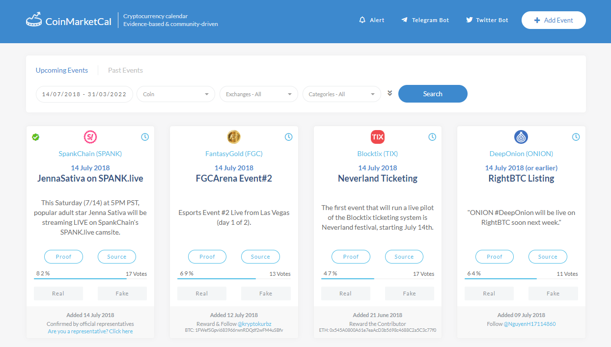 CoinMarketCal — простой, а главное удобный календарь событий. Фильтр по датам, рейтинг ожидания и возможность настройки оповещений по e-mail делают его незаменимым источником сигналов.